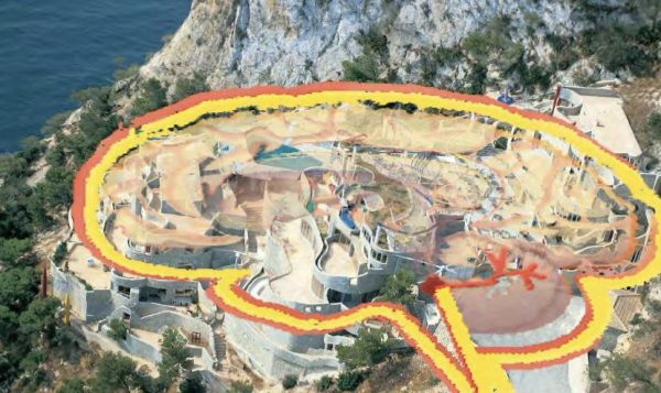 Die Felsformationen werden nicht zerstört, sondern strukturell einbezogen. Dies antizipiert nachhaltige Baukonzepte und eine frühe Symbiose von Geologie und Architektur.